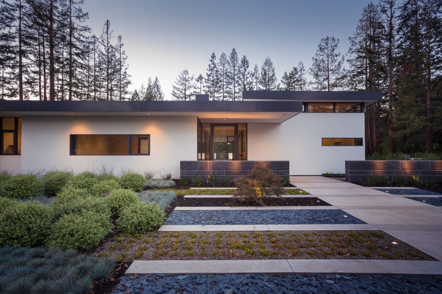 Sustainable measures included a full 7.1kW solar photovoltaic array technically making the house off the grid, and arranged so that no panels are visible from the property. A large 16,000 gallon rainwater catchment system consisting of tanks buried below grade was installed. The home is California GreenPoint rated and also features sealed roof soffits and a sealed crawlspace without the usual venting. A whole house computer automation system with server room was installed as well. Heating and cooling utilize hot water radiant heated concrete and wood floors supplemented by heat pump generated heating and cooling.