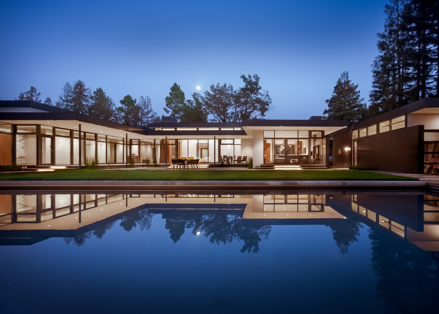 The residence is simply divided into two wings of public use, kitchen and family room, and the other wing of bedrooms, connected by the living and dining great room. Function drove the exterior form of windows and solid walls with a line of clerestory windows which bring light into the middle of the large home. Extensive sun shadow studies with 3D tree modeling led to the unorthodox placement of the pool to the north of the home, but tree shadow tracking showed this to be the sunniest area during the entire year.